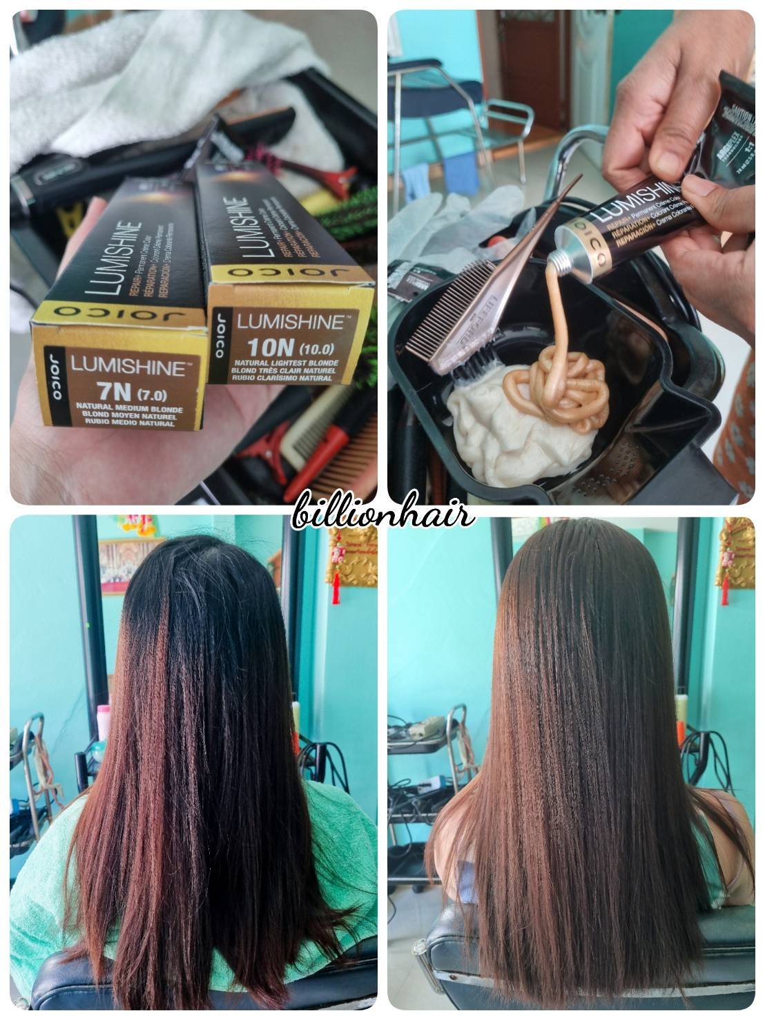 สีทีีใช้ 7N+9N Joico lumishine ผสมกัน 1 : 1 แล้วย้อมปกติที่โคนก่อนไล่ปลายตามมาทิ้งระยะเวลา 45 นาทีล้างออก
