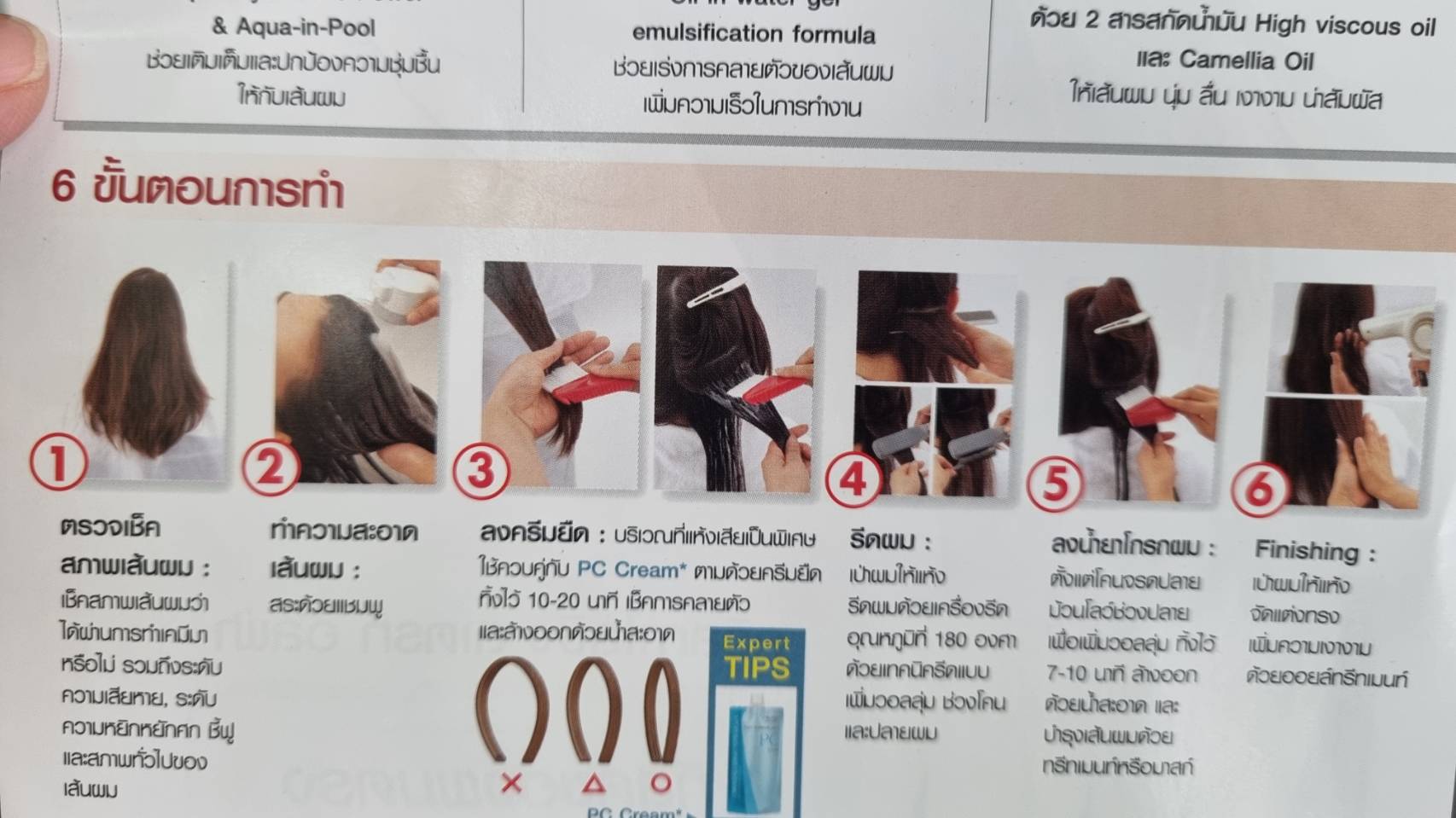 ลงครีมยืดผม ลงบนเส้นผม ทิ่งไว้ 10-20 นาที เช็คการคลายตัวและล้างออกด้วยน้ำสะอาด